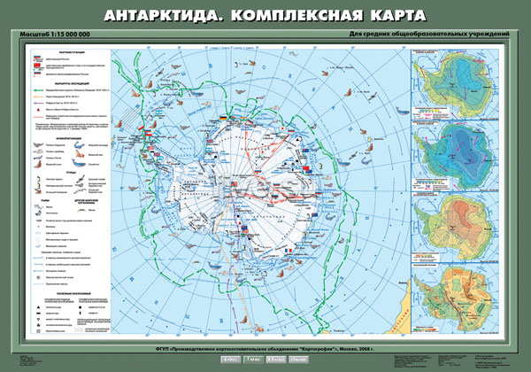 На карте цветными флажками обозначены научные станции, работающие в Антарктиде, стрелками маршруты экспедиций.