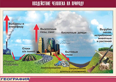 Демонстрационная таблица "Воздействие человека на природу" применяется в качестве демонстрационного наглядного пособия на уроках географии. Может использоваться для оформления школьного кабинета географии.